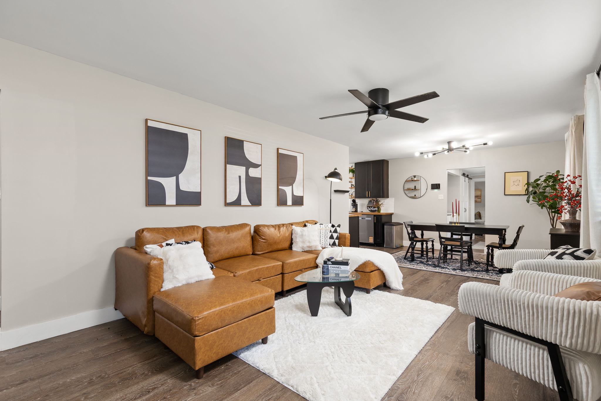 – Open-concept living area with a plush section, accent chairs, and direct access to dining and kitchen area.