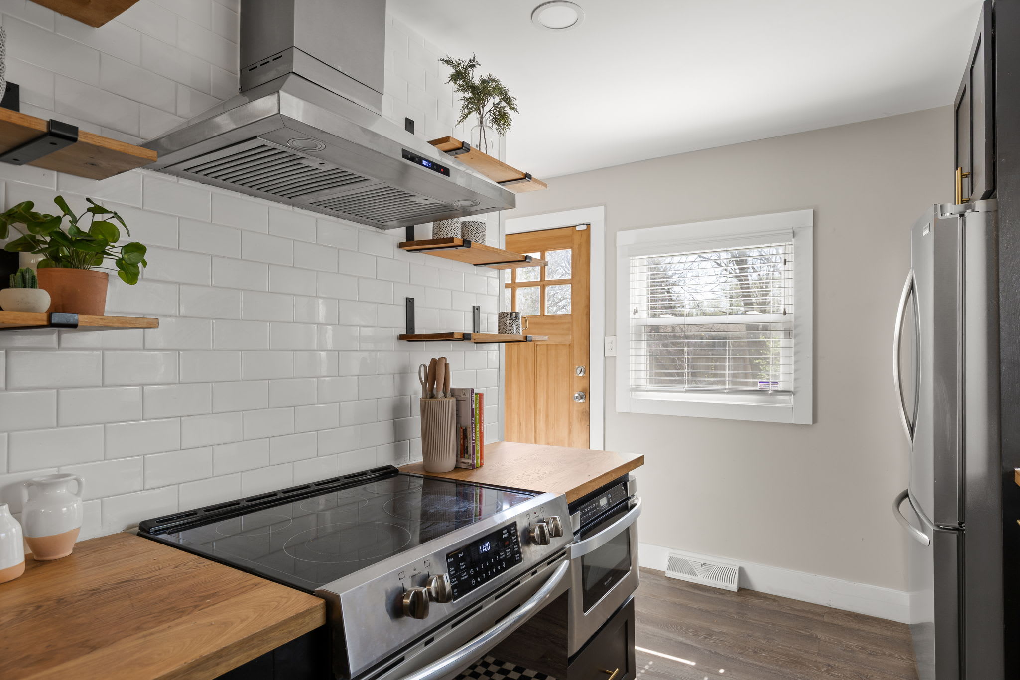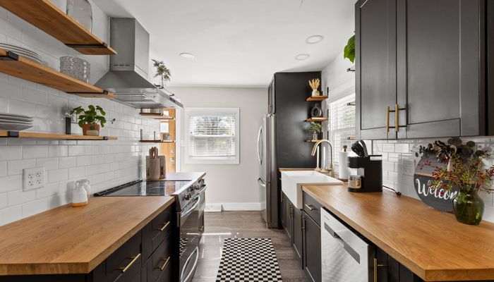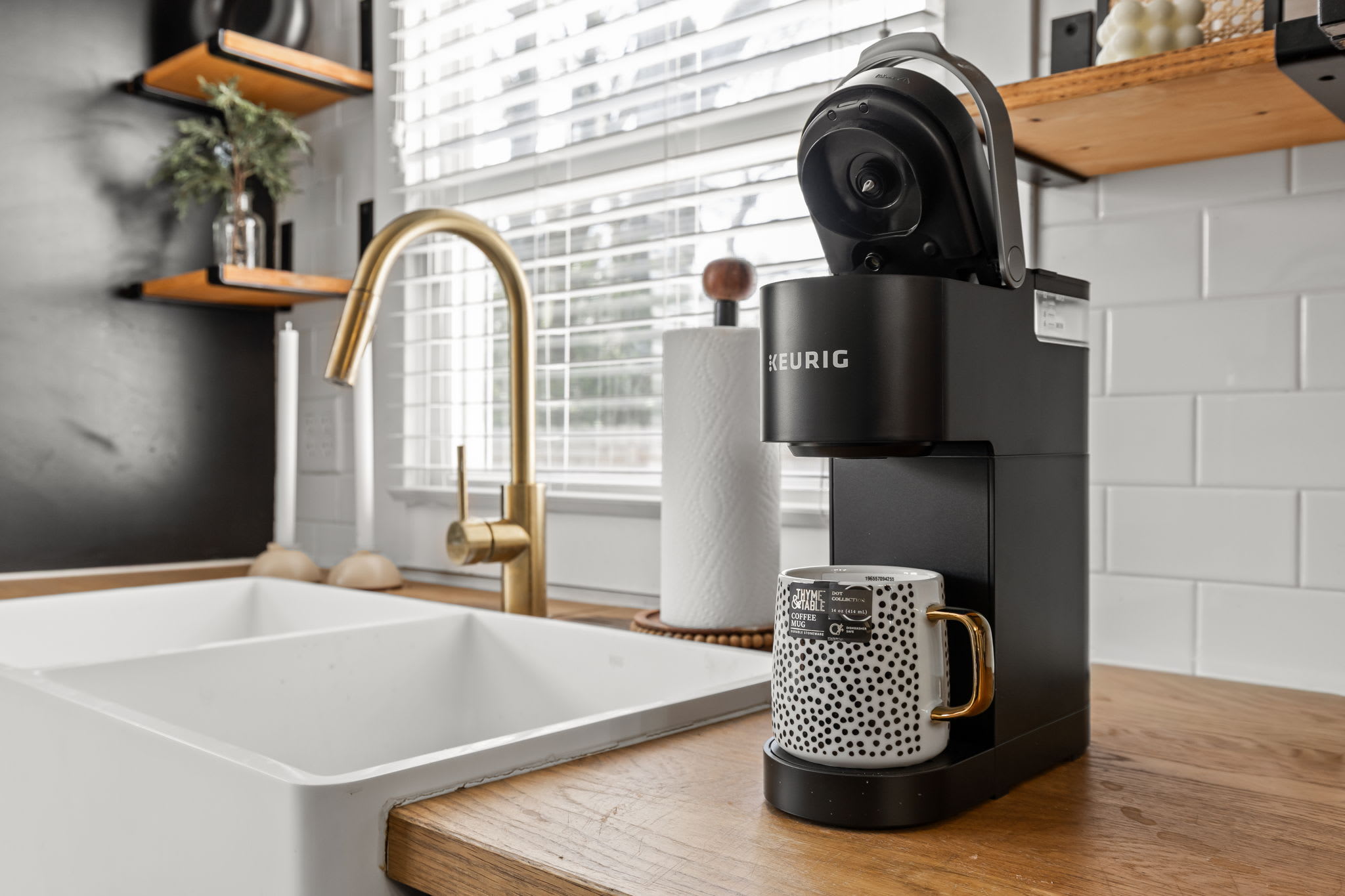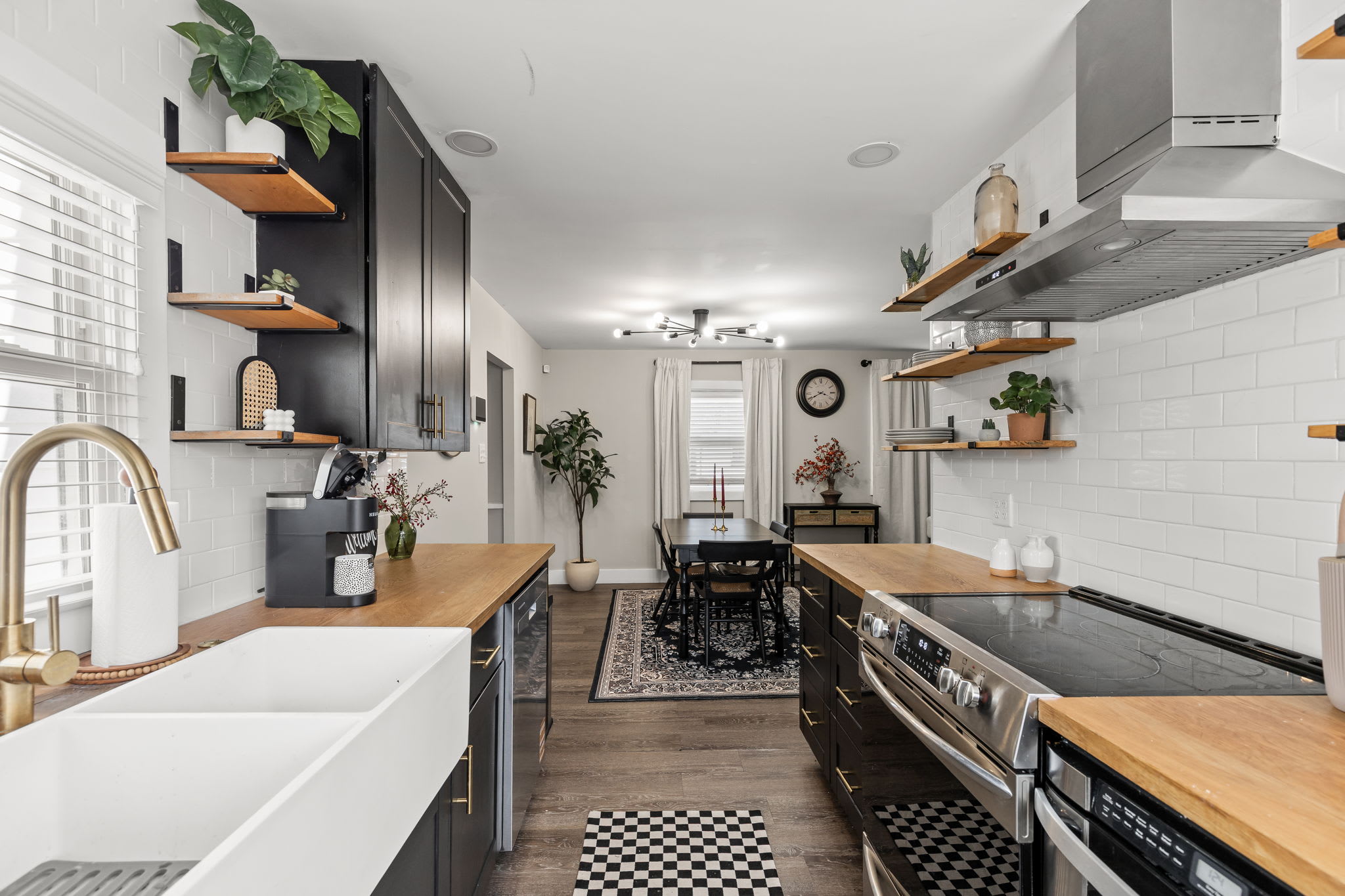 – Fully equipped kitchen with stainless steel appliances, modern open shelving, and keurig with coffee pods!