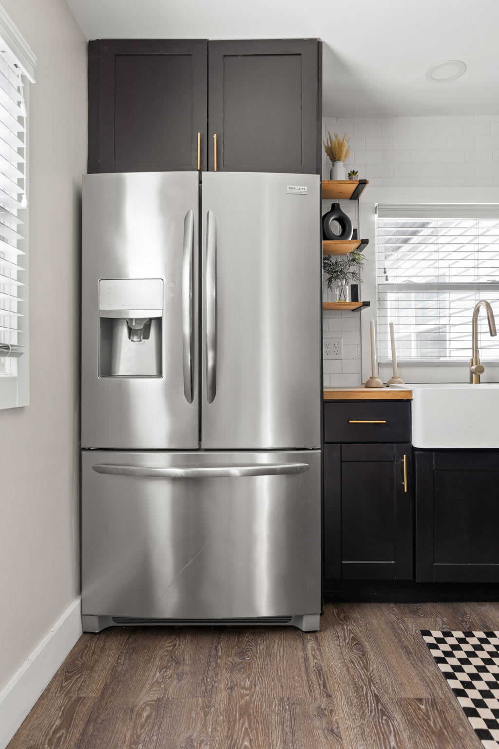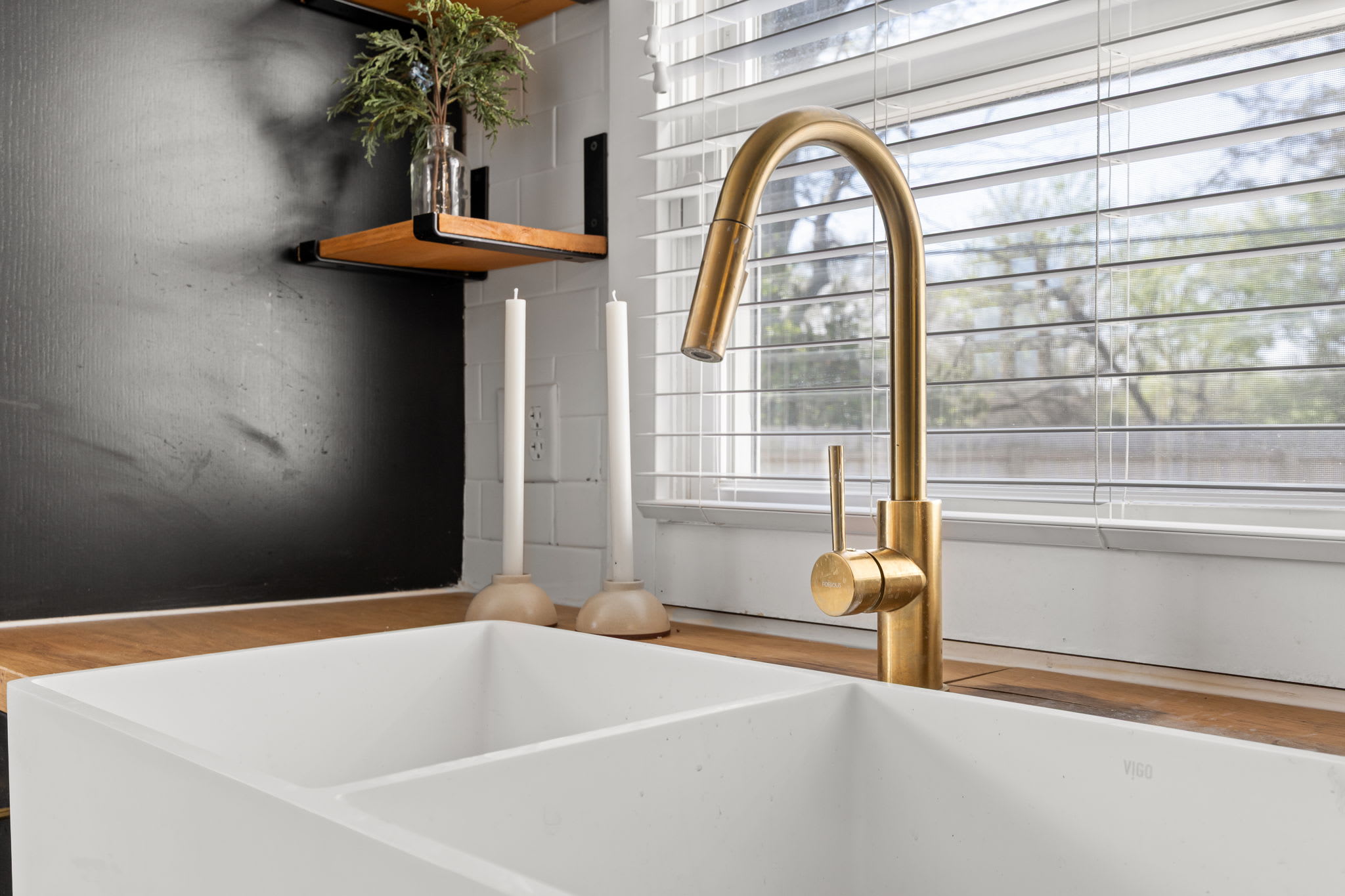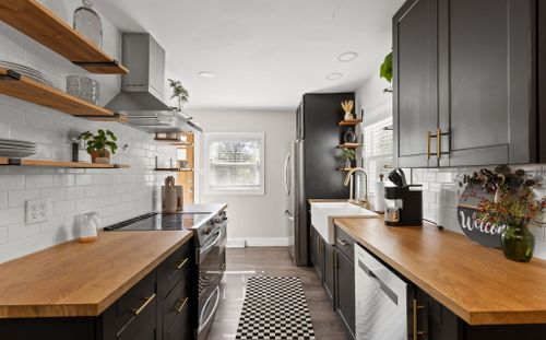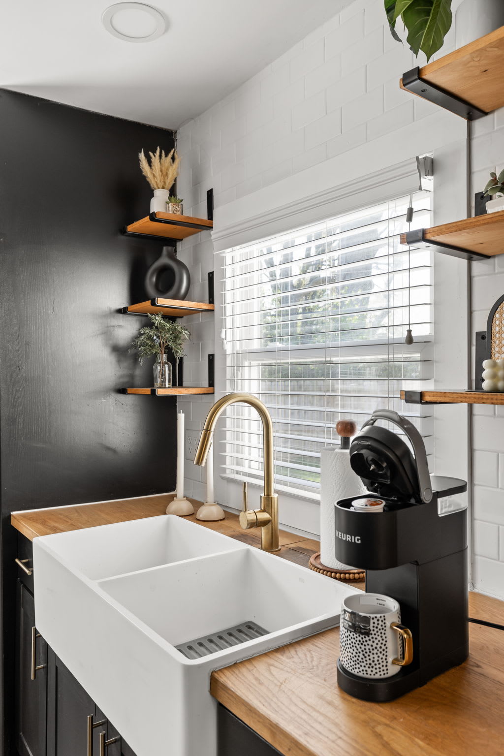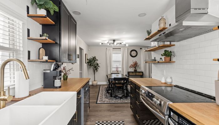– Fully equipped kitchen with stainless steel appliances, modern open shelving, and keurig with coffee pods!