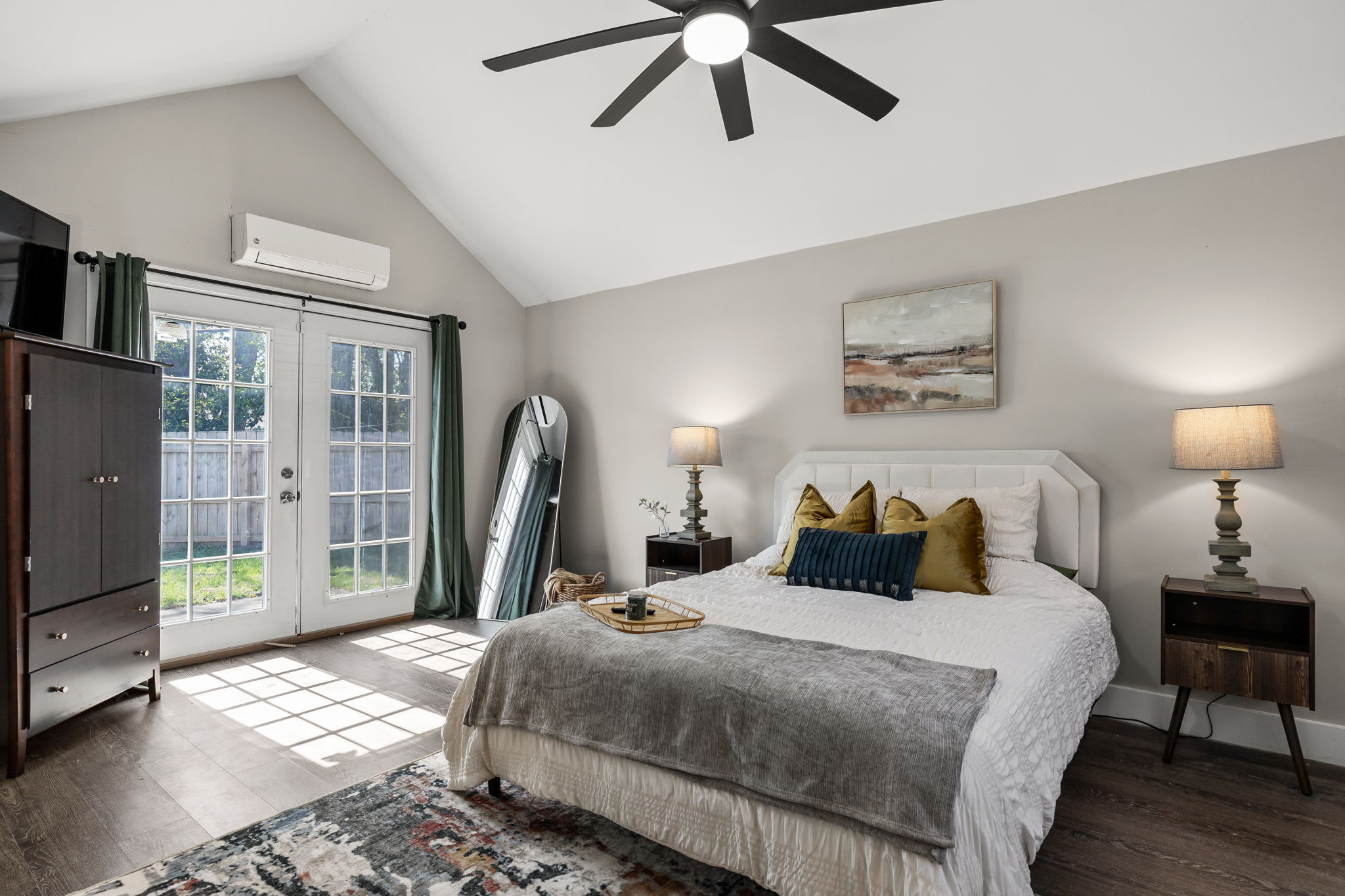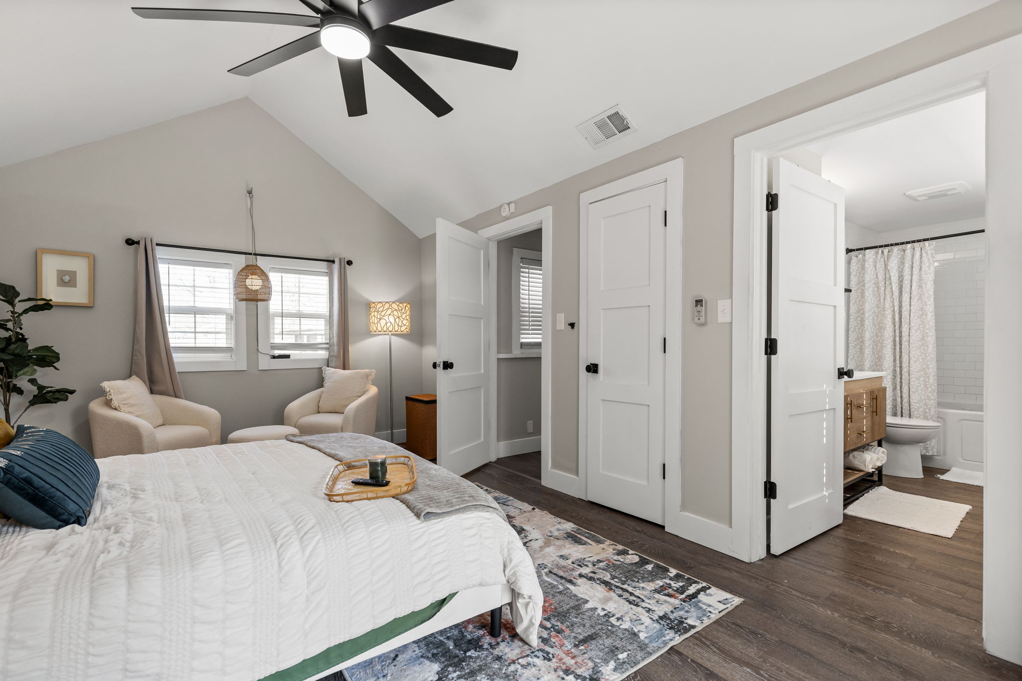 ⭐️ Primary Bedroom – Queen-size bed, 2 comfy and cozy chairs for relaxing, TV and access to backyard