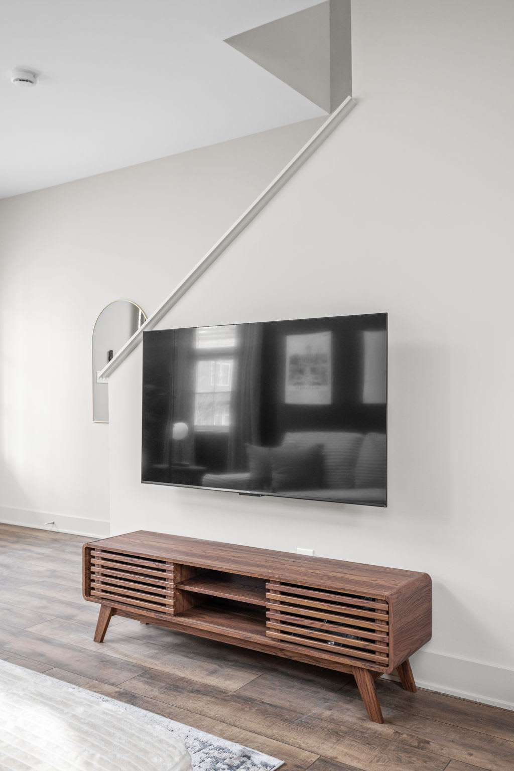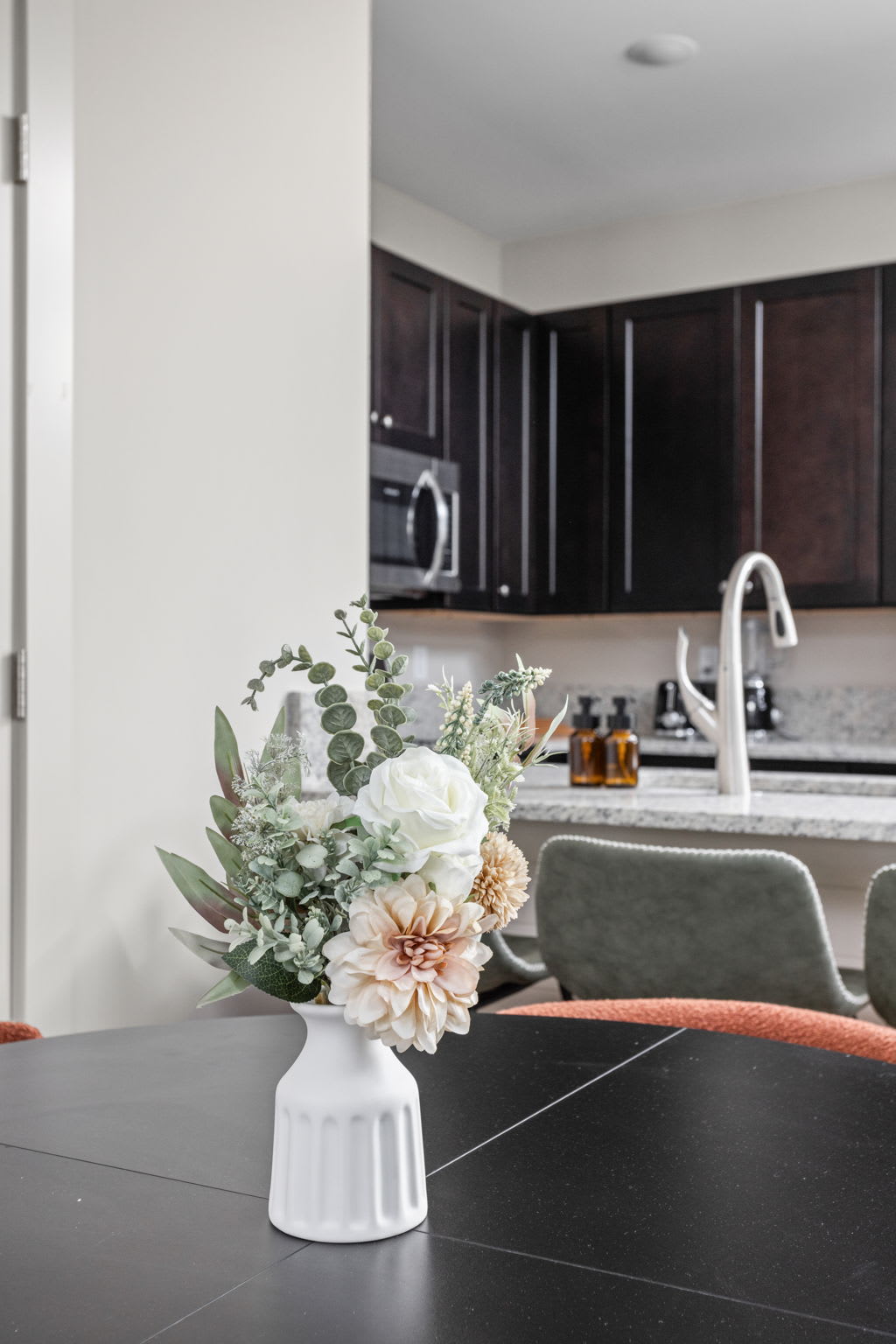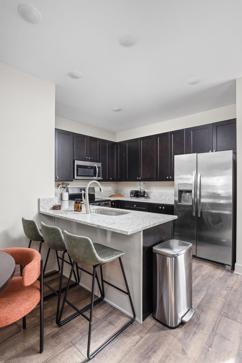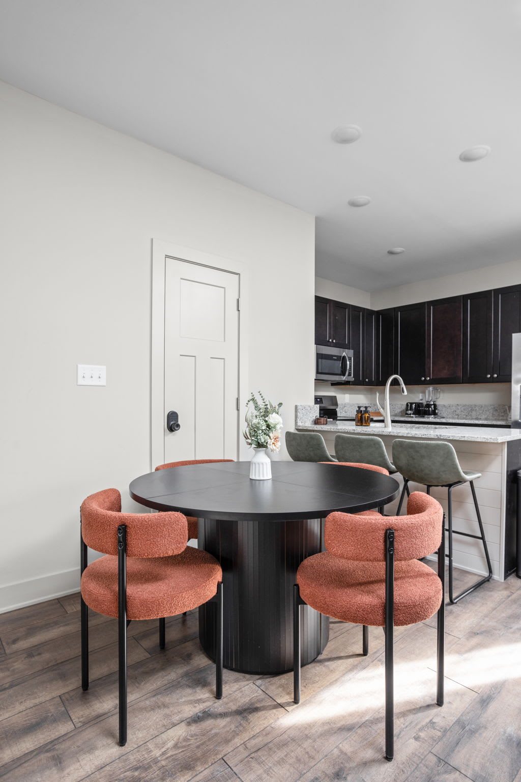 As you step inside, you’re greeted with an open-concept living, dining, and kitchen space, beautifully tied together, trendy art, and a serene, zen-inspired atmosphere. The living room features a cozy sectional sofa, an accent chair, extra lighting, and a smart TV — perfect for unwinding after a day in the city — while the dining table for four and bar seating for three create an inviting space to gather.
