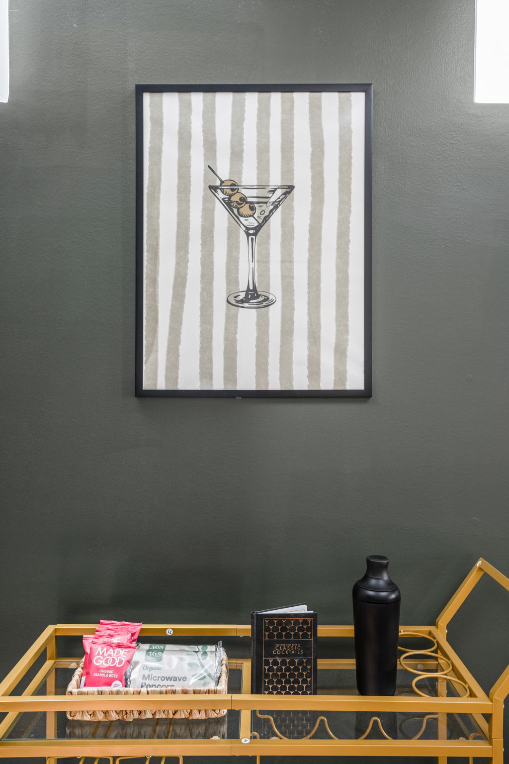 – Bar cart to stock your favorites and settle in, ready for your signature cocktail.