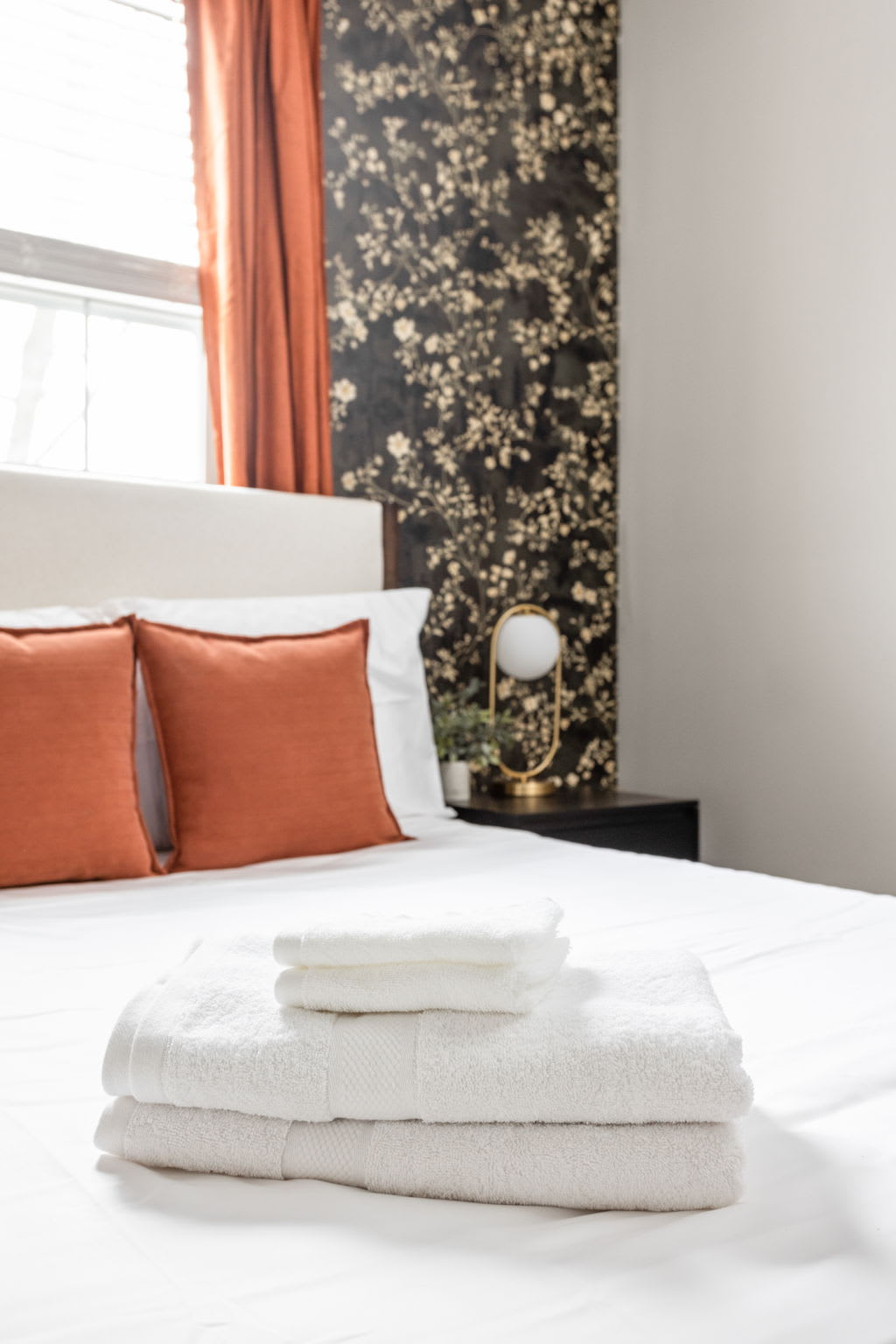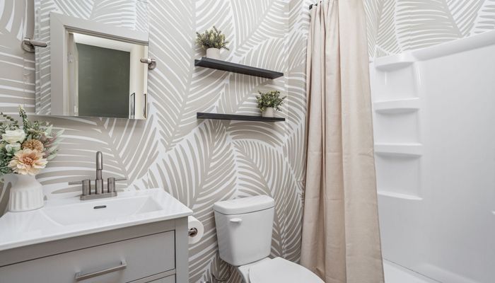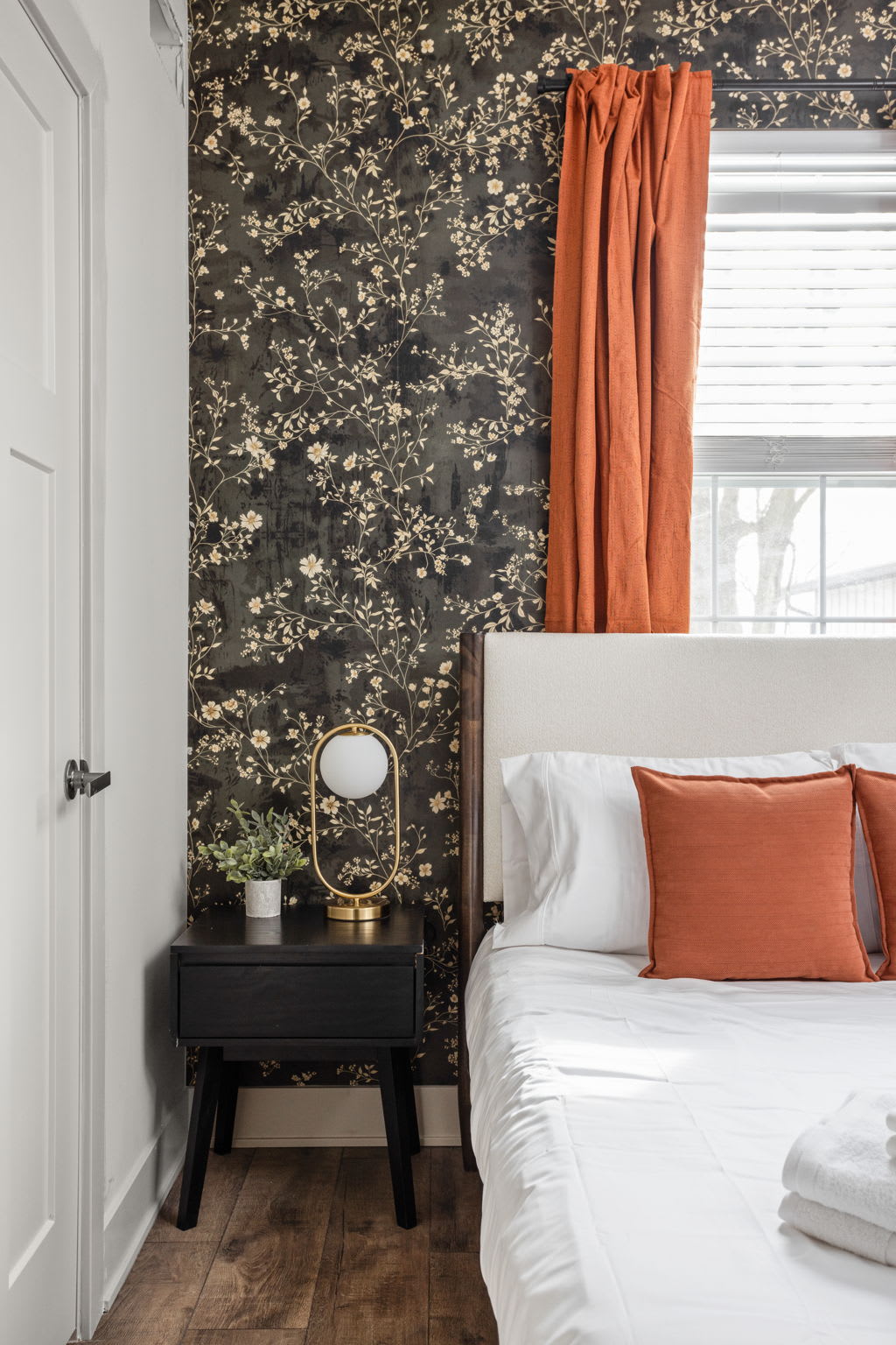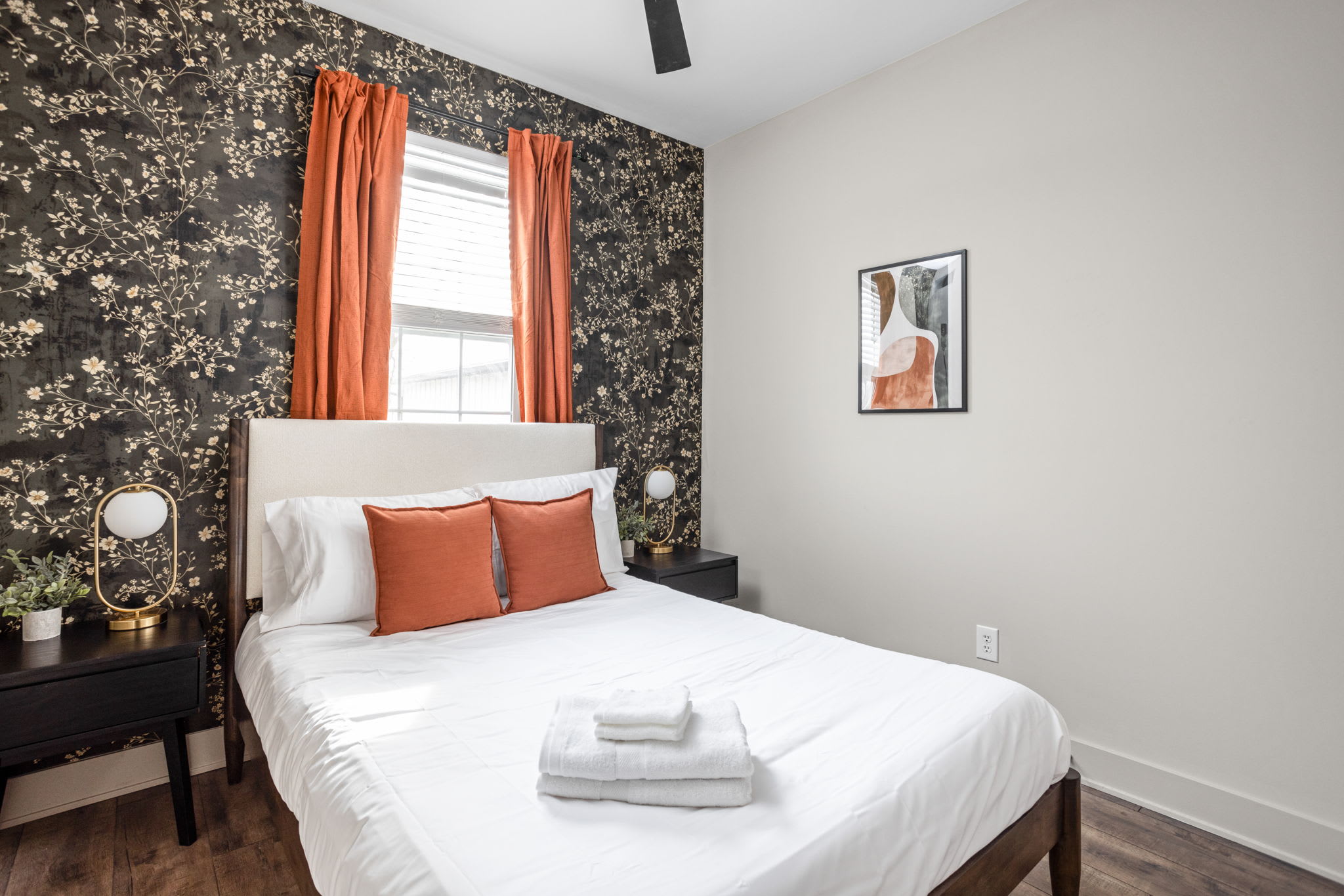 The fully stocked kitchen includes all the essentials for your stay, plus elevated touches like organic coffee and a curated welcome basket with organic popcorn and granola to get you started. Just off the kitchen, you’ll find the first bedroom featuring a full bed, nightstands, and a sound machine/alarm clock for restful sleep. The nearby full bathroom is a design moment of its own, complete with a vanity, walk-in shower, and fully wallpapered walls that add a boutique feel.