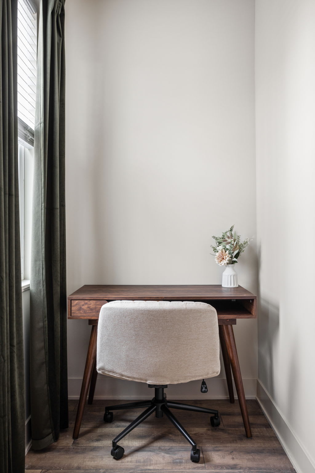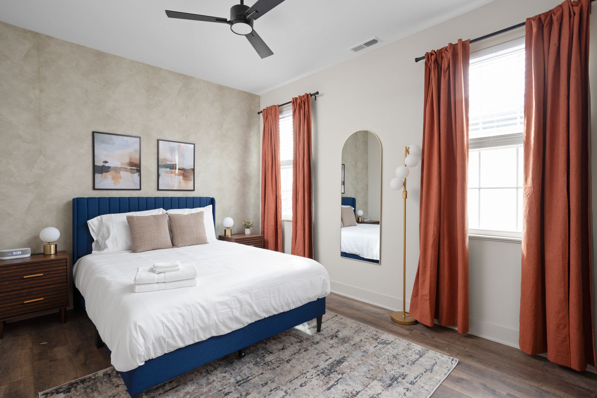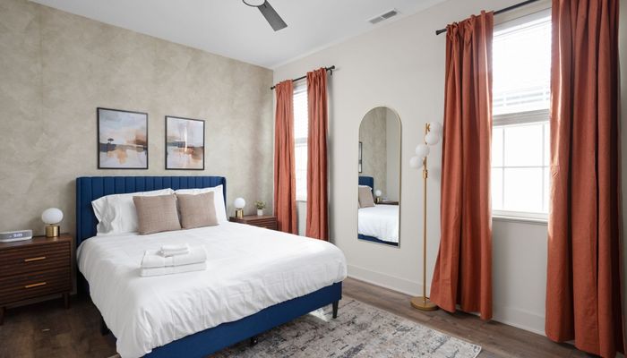 Upstairs, convenience meets comfort. A washer and dryer are available for your use, and we provide laundry detergent and dryer sheets to begin your stay. The front upstairs bedroom features a queen bed, desk space for remote work or catching up on emails, full-length mirror, nightstands, and a sound machine/alarm clock. Its private ensuite bathroom offers a double vanity, a lighted mirror, and a spacious walk-in shower.