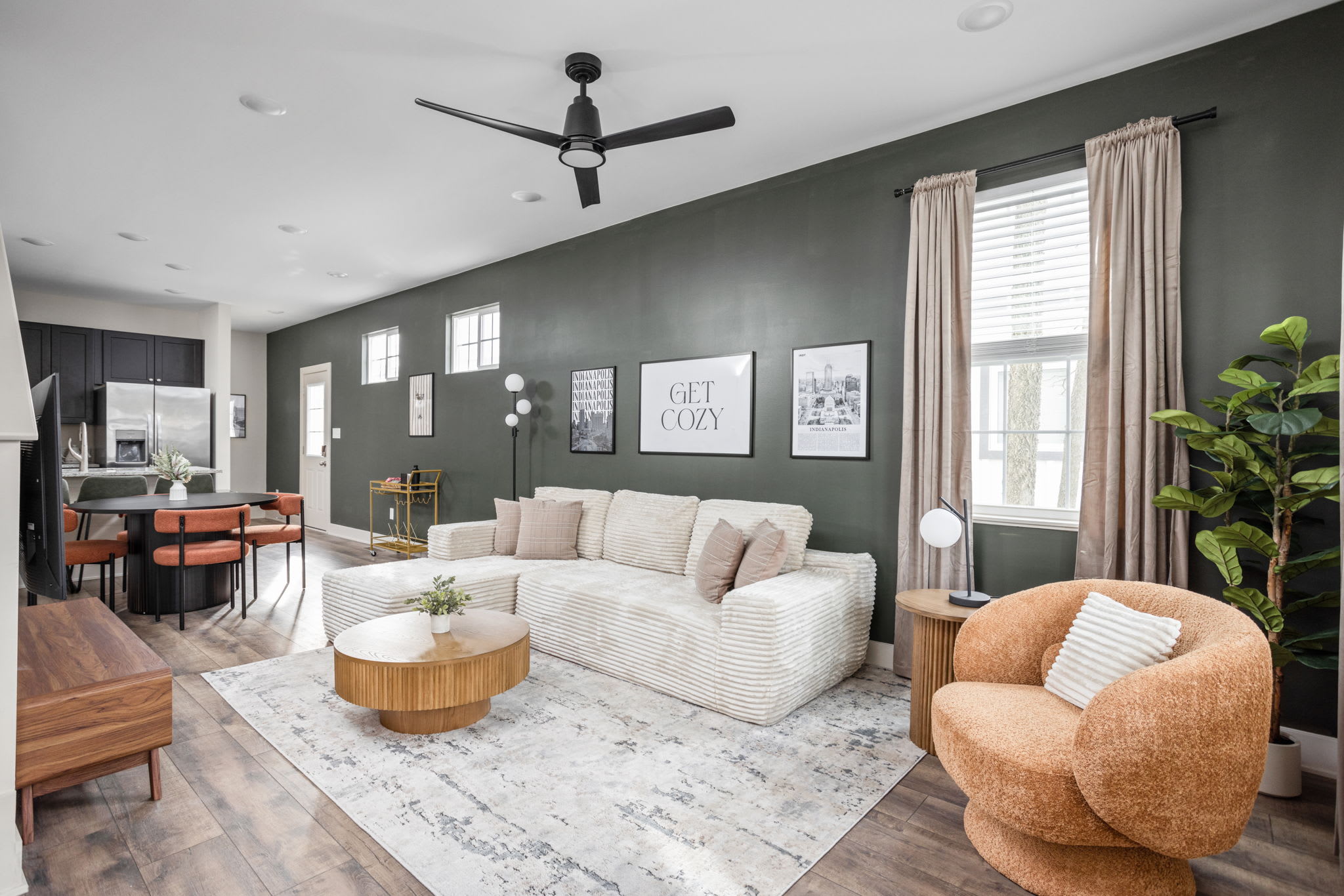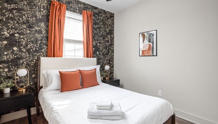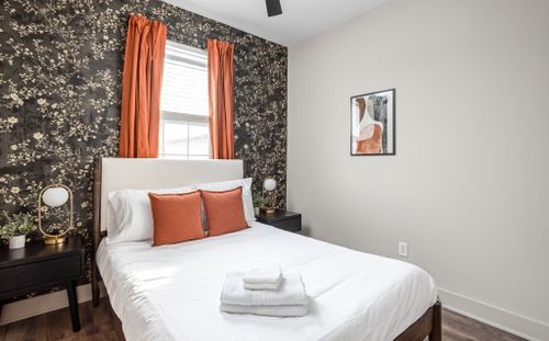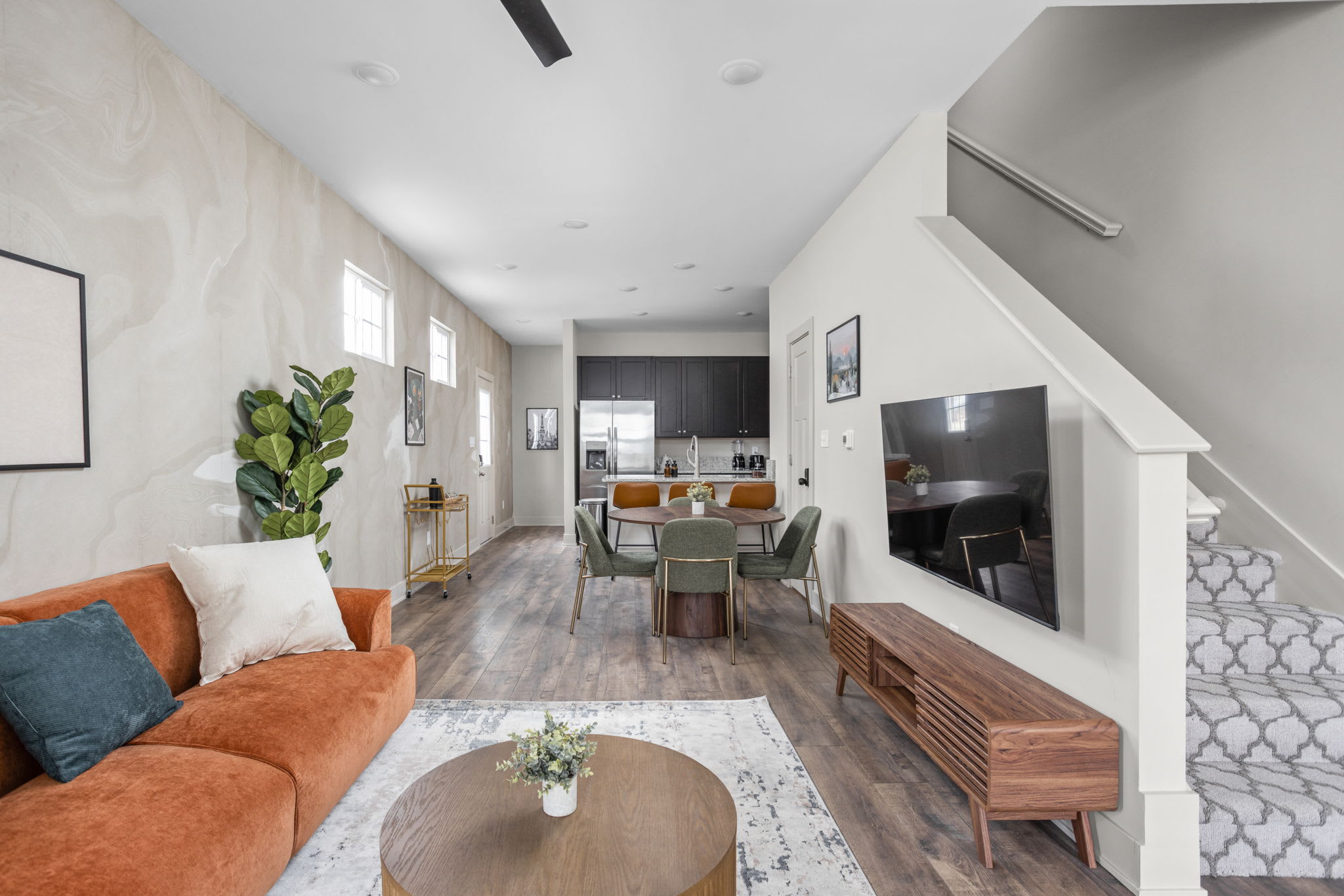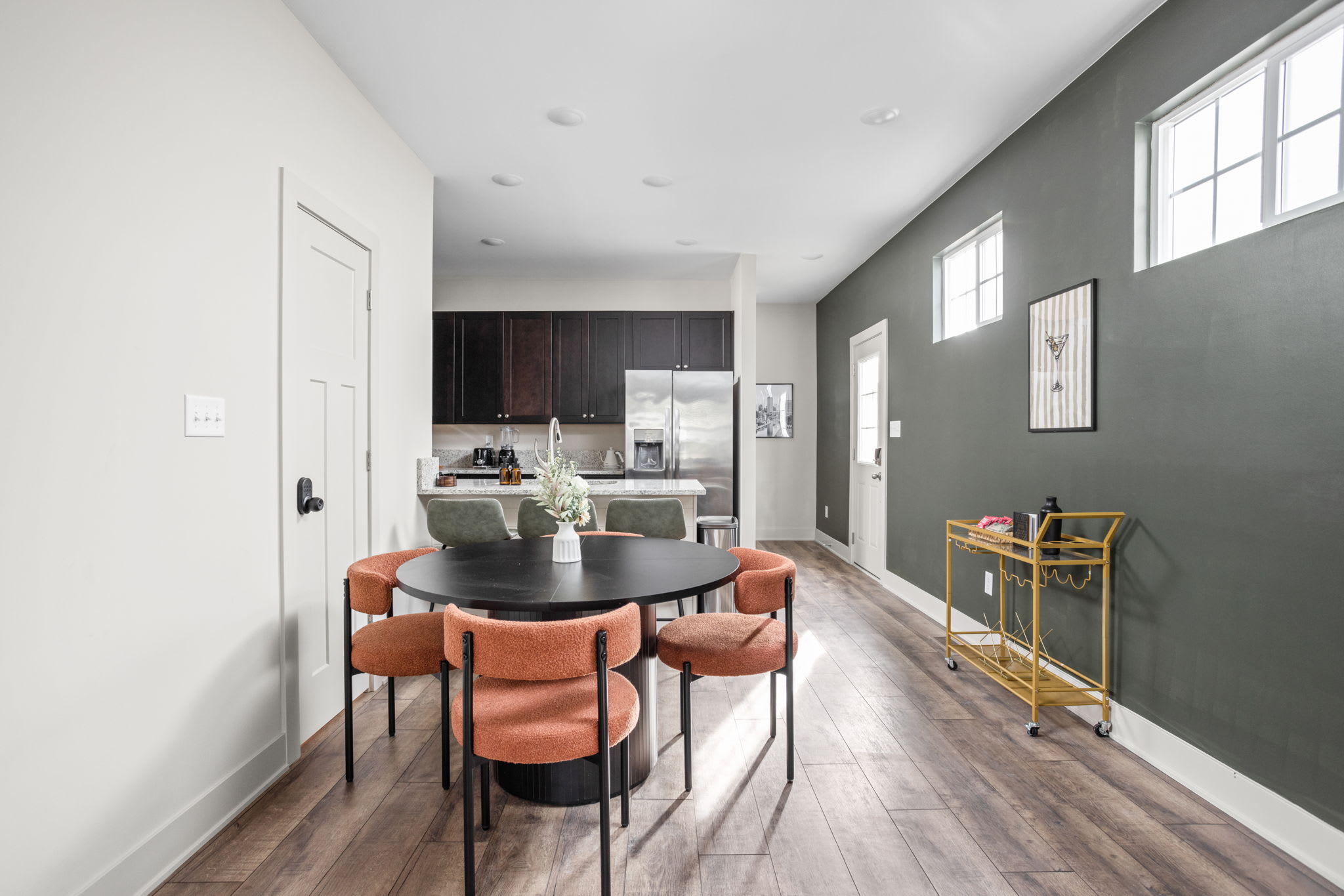 Each side of the duplex mirrors the other in layout and intention, featuring open-concept living, dining, and kitchen spaces with calming wallpapered accents, trendy local art, and a zen-inspired atmosphere throughout. With two fully equipped kitchens, two living rooms, and multiple dining areas, your group can spread out comfortably while enjoying the seamless flow of both homes.