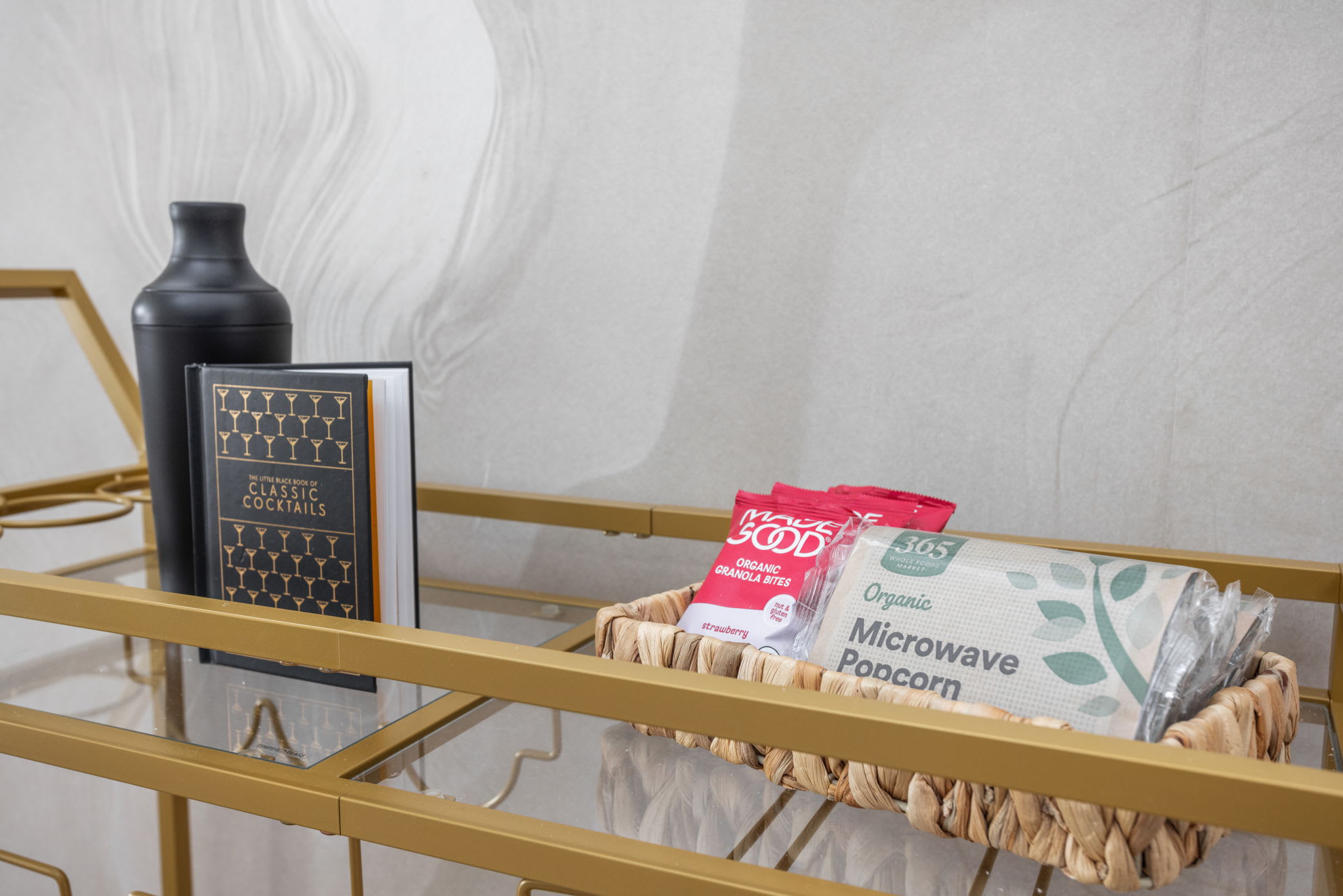– Bar carts to stock your favorites and settle in, ready for your signature cocktail.