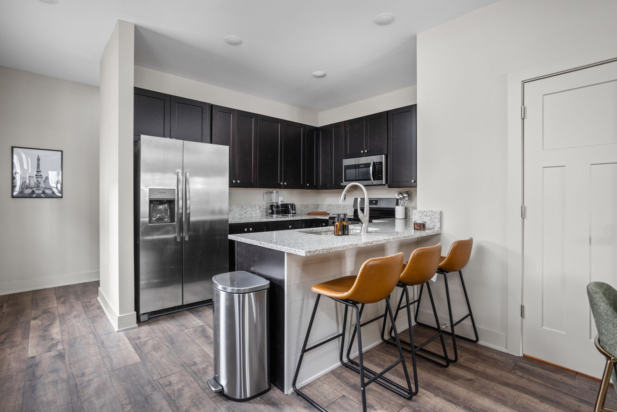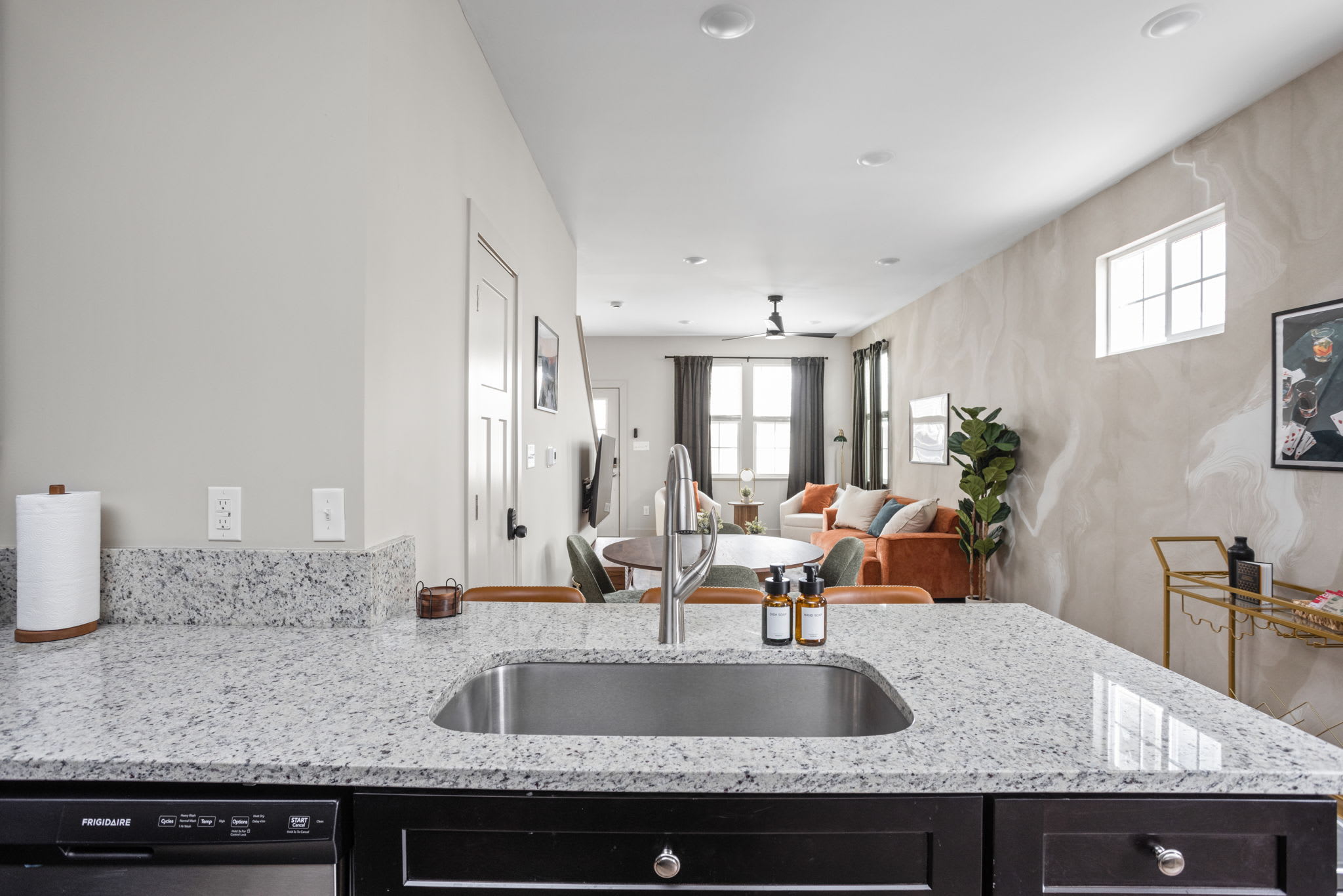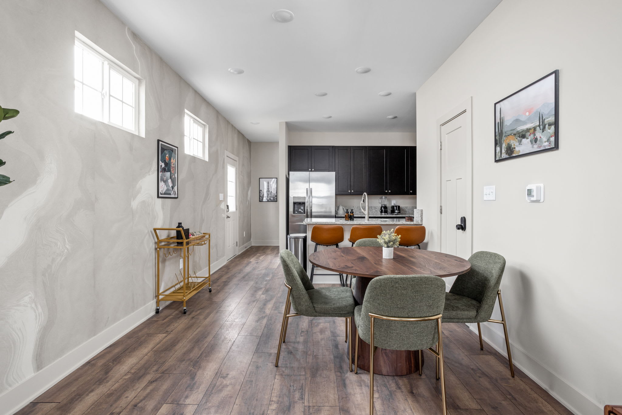 As you step inside, you’re greeted with an open-concept living, dining, and kitchen space, beautifully tied together with wallpapered accent walls, trendy art, and a serene, zen-inspired atmosphere. The living room features a cozy sofa, two accent chairs, extra lighting, and a smart TV — perfect for unwinding after a day in the city — while the dining table for four and bar seating for three create an inviting space to gather.