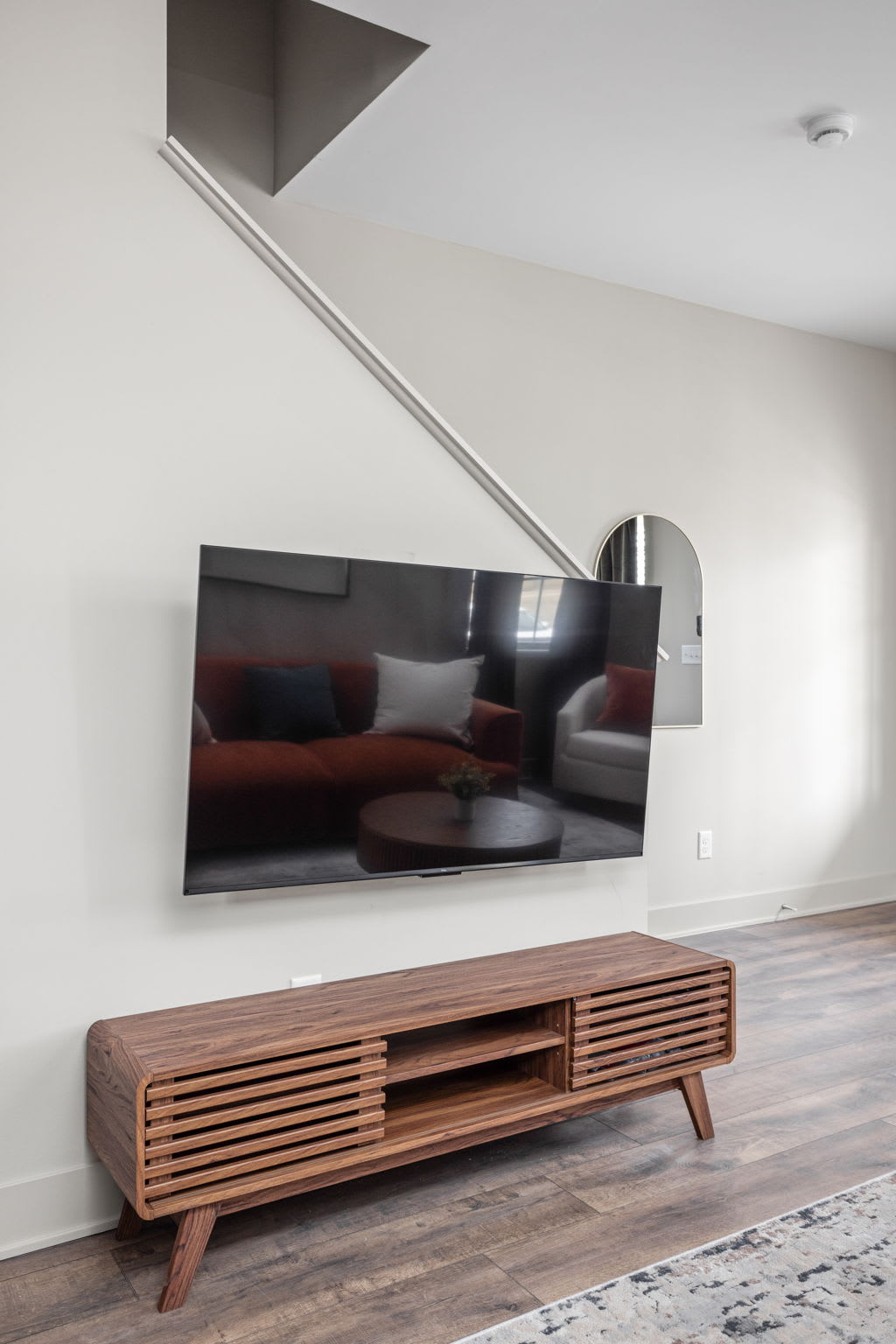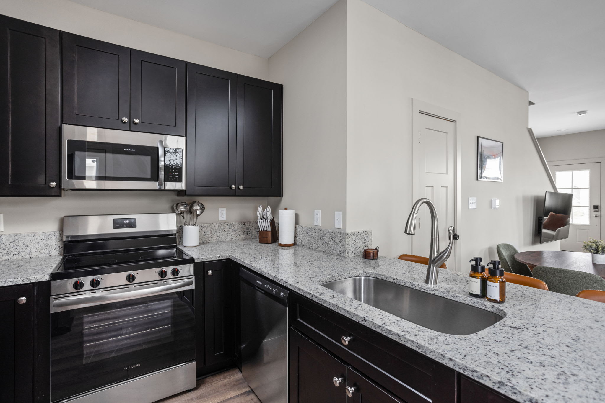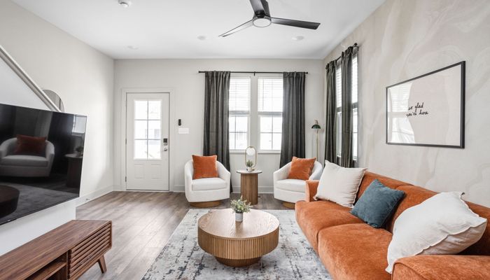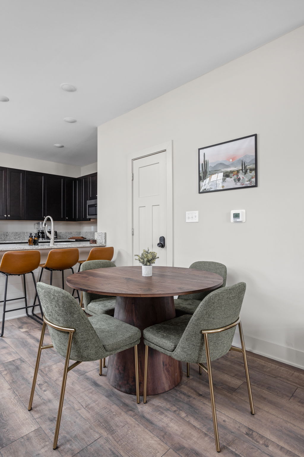As you step inside, you’re greeted with an open-concept living, dining, and kitchen space, beautifully tied together with wallpapered accent walls, trendy art, and a serene, zen-inspired atmosphere. The living room features a cozy sofa, two accent chairs, extra lighting, and a smart TV — perfect for unwinding after a day in the city — while the dining table for four and bar seating for three create an inviting space to gather.