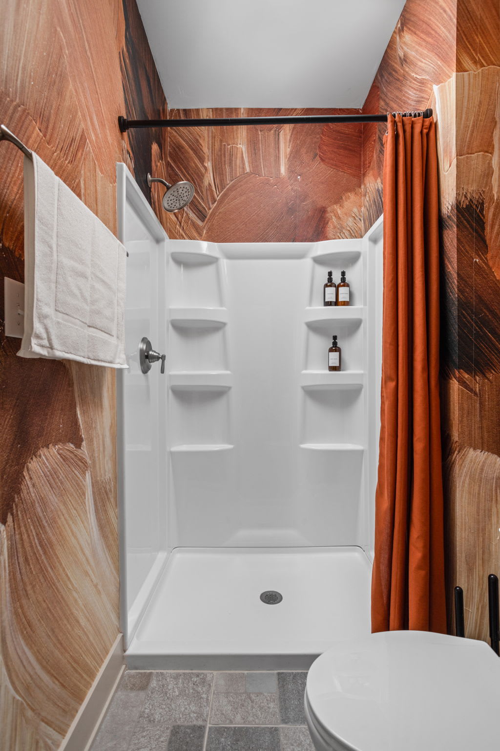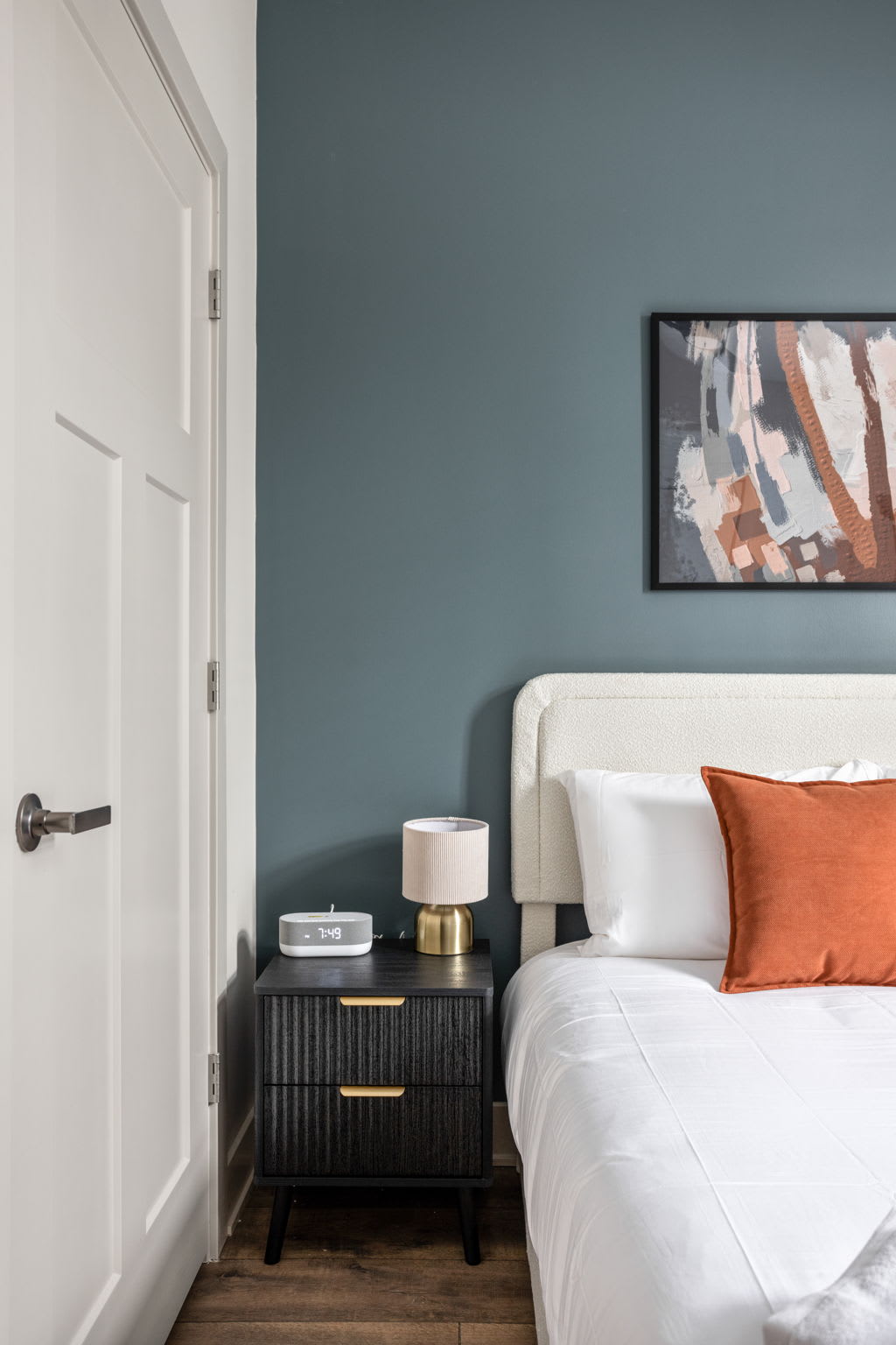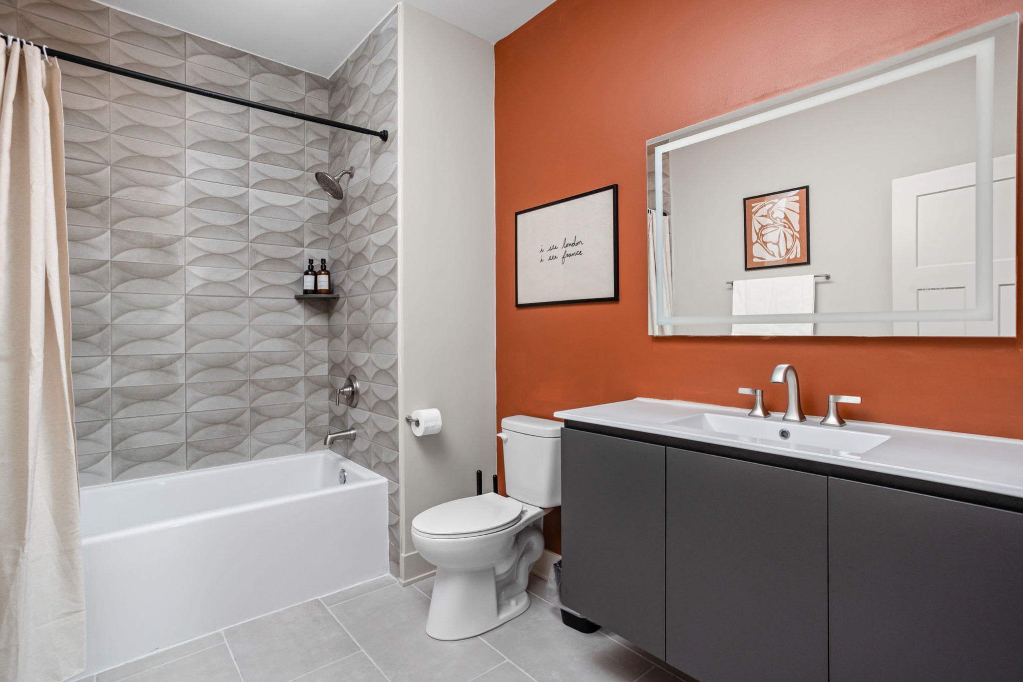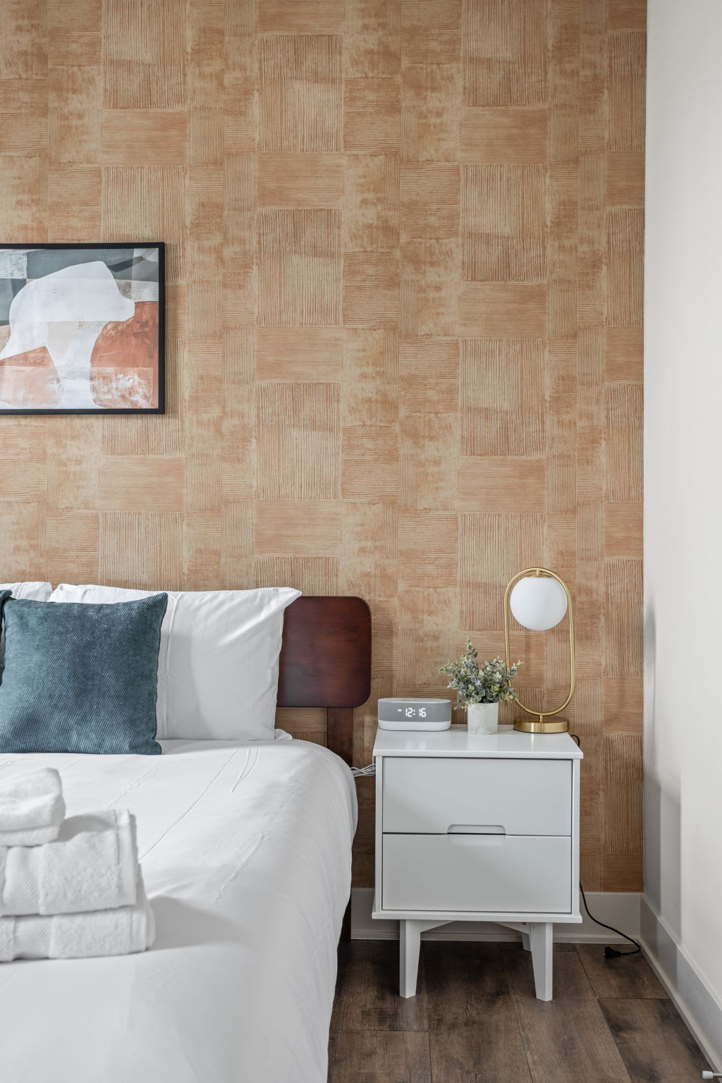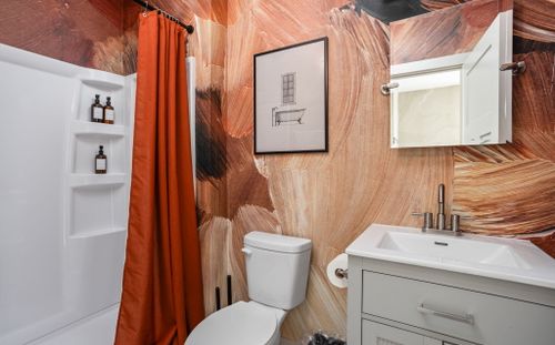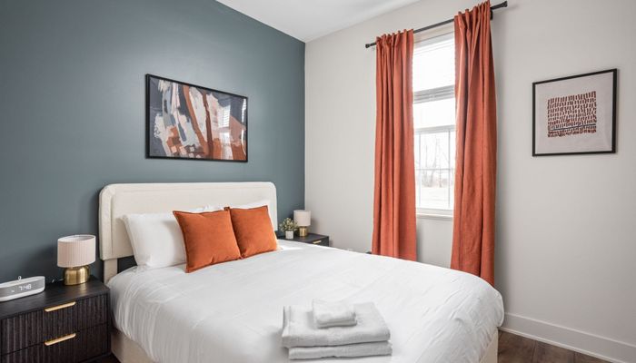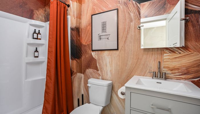 The fully stocked kitchen includes all the essentials for your stay, plus elevated touches like organic coffee and a curated welcome basket with organic popcorn and granola to get you started. Just off the kitchen, you’ll find the first bedroom featuring a full bed, nightstands, and a sound machine/alarm clock for restful sleep. The nearby full bathroom is a design moment of its own, complete with a vanity, walk-in shower, and fully wallpapered walls that add a boutique feel.