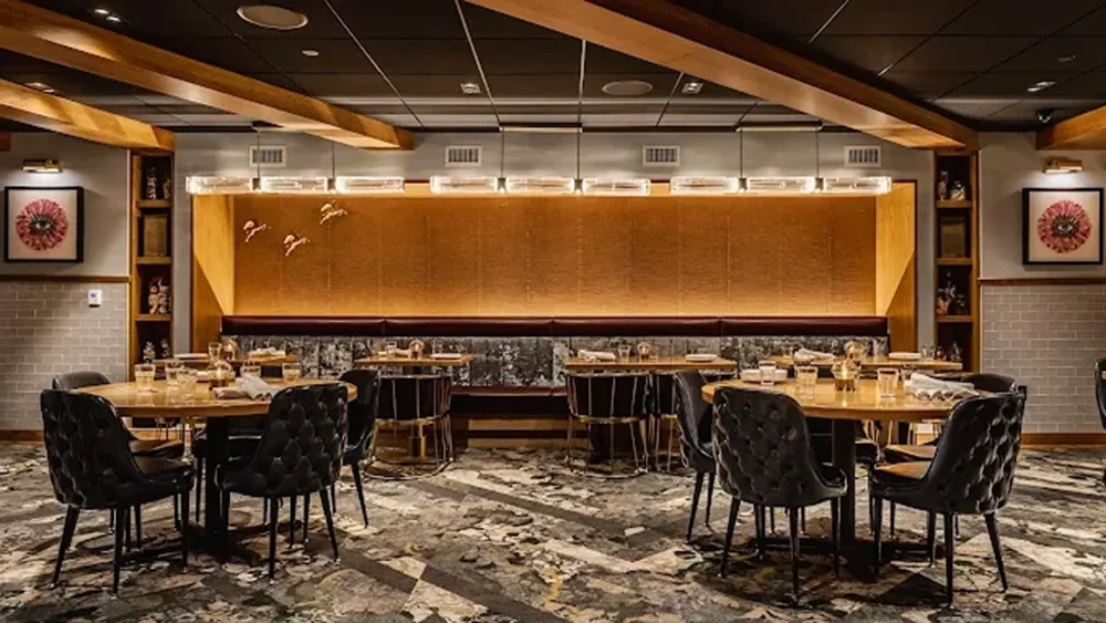 A stylish departure from steakhouse tradition, The Fountain Room embraces Supper Club flair without the formality, blending fine dining with unabashed fun. Guests can indulge in timeless fare, including pickled relish trays, richly flavorful prime rib, classic side dishes, and house-made desserts, paired with strong cocktails and a well-curated wine list. The stunning space features velvet banquettes, glowing chandeliers, and a reel-to-reel machine that evokes a sense of nostalgia. Look for the historic Bottleworks hotel entrance and listen for sounds of mischief.